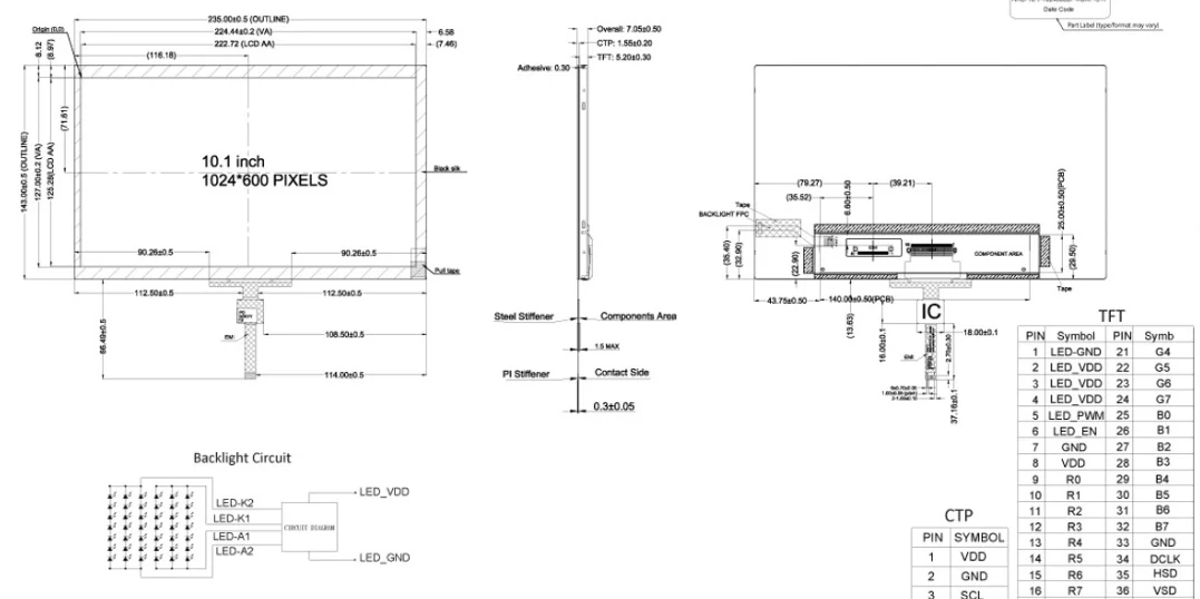 10,1 colio pramoninio PCAP jutiklinio ekrano modulis turi 1024 × 600 HD su visais žiūrėjimo kampais, palaiko SPI/MCU mažos galios sąsajas ir 30 000 valandų foninio apšvietimo veikimo laiką. Jis tinka planšetiniams kompiuteriams, išmaniesiems garsiakalbiams ir dronų nuotolinio valdymo pultams, todėl siūlo ekonomišką naujoviško dizaino sprendimą.
